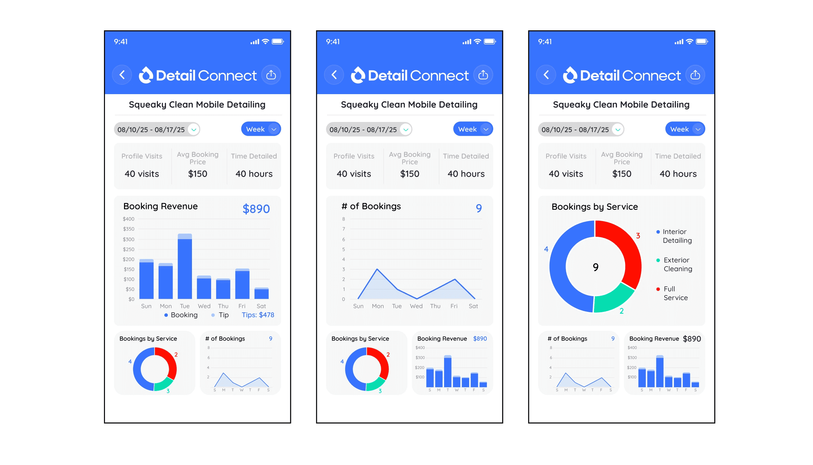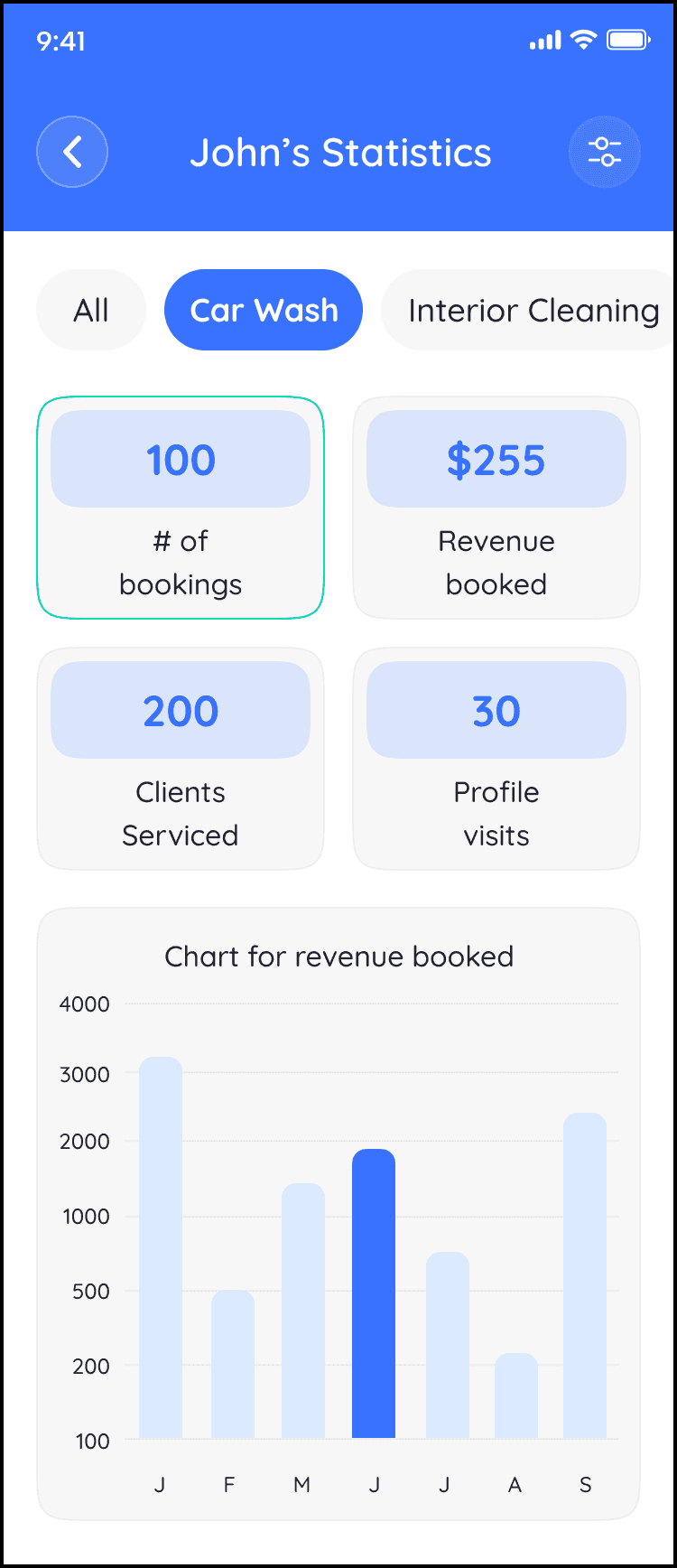 In our redesign, we added options to view their statistics weekly, monthly, yearly, or all-time. Detailers would have all the data they need to see their progression and analyze the trends in their bookings. We added bookings by service, average booking price, and total time detailed to give detailers practicality specificity when looking at their analytics.