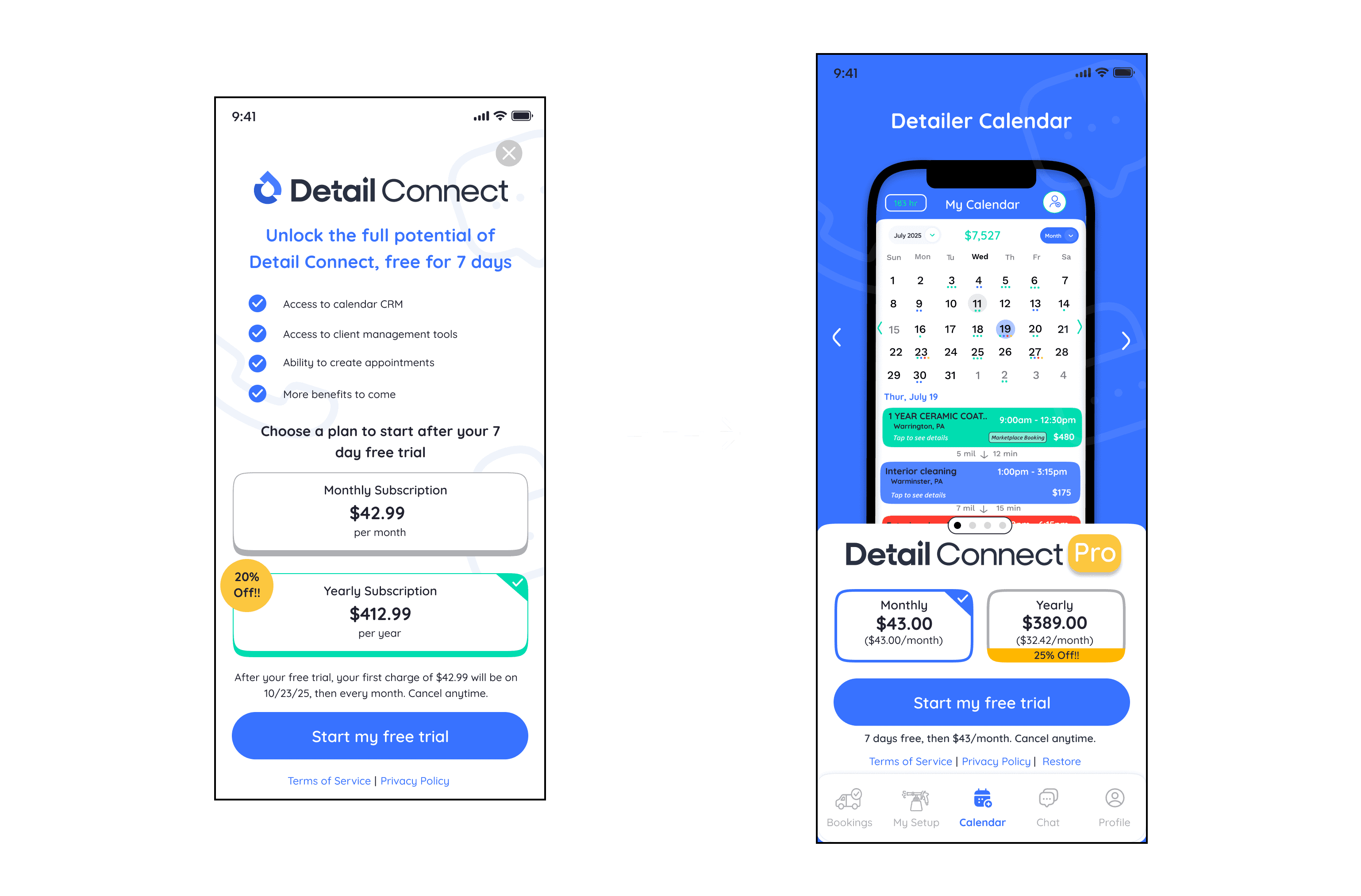 Their personal links allowed clients to book remotely through the web in less than five minutes. Additionally, I designed the subscription service page where detailers choose their plan and subscribe. Due to my NDA, I cannot disclose all the features that are in development for Detail Connect Pro.